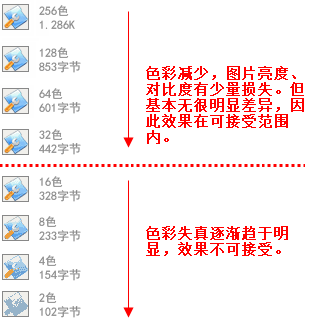 由此可見(jiàn),上述四張圖中,在肉眼可辨識(shí)情況下,64色的圖片對(duì)比256色圖片,輸出后可以少掉一半還多的字節(jié)數(shù),且效果完全能滿足視覺(jué)要求。不要小看這幾百個(gè)字節(jié),試想網(wǎng)站里幾百?gòu)垐D片,如果每張圖都節(jié)省一些,最終可以節(jié)省多少空間出來(lái)?