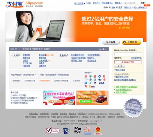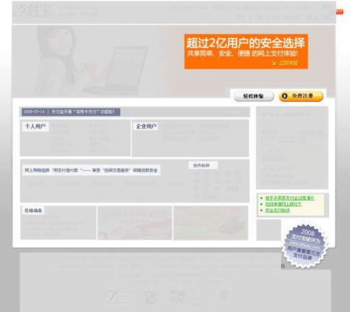 支付寶:大banner分為2塊,左邊是代表著用戶的大美女,右邊是體現(xiàn)實(shí)力的宣言“超過2億用戶的安全選擇”,輔助小字為:共享簡(jiǎn)單、安全、快捷的網(wǎng)上支付體驗(yàn),具有親合力的美女,醒目的大標(biāo)語,傳達(dá)給用戶的信息,支付寶的內(nèi)容構(gòu)思很明顯比財(cái)付通更直接有效。