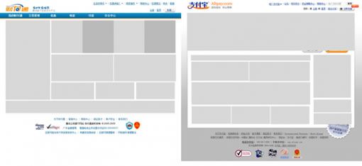 支付寶:兩個(gè)大按鈕(輕松體驗(yàn)、免費(fèi)注冊(cè)),動(dòng)態(tài)信息區(qū),個(gè)人用戶,企業(yè)用戶,流程演示,合作伙,公司動(dòng)態(tài),新手問題,圓形標(biāo)簽圖,兩個(gè)廣告區(qū)。