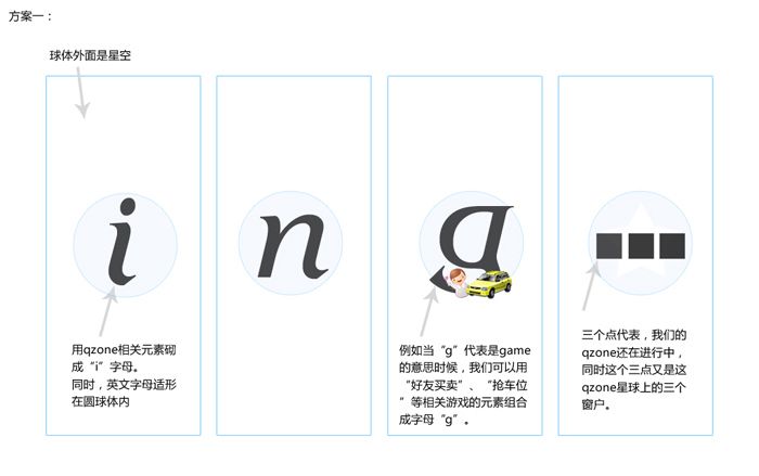 在構(gòu)思logo的設(shè)計(jì)時(shí),首先把現(xiàn)有的能代表空間元素和發(fā)散想象的與活動(dòng)主題相關(guān)的元素都羅列出來(lái),比如空間固有元素星球、五角星、代表”Qzone”的Z;結(jié)合活動(dòng)主題構(gòu)想的元素有文字“Qzoneing”、彩帶、光環(huán)、皇冠等等;接下來(lái)就是這些關(guān)鍵詞視覺(jué)化并相互碰撞組合成新的圖形。把覺(jué)得滿意的構(gòu)思從草圖中篩選處理進(jìn)行繪制。