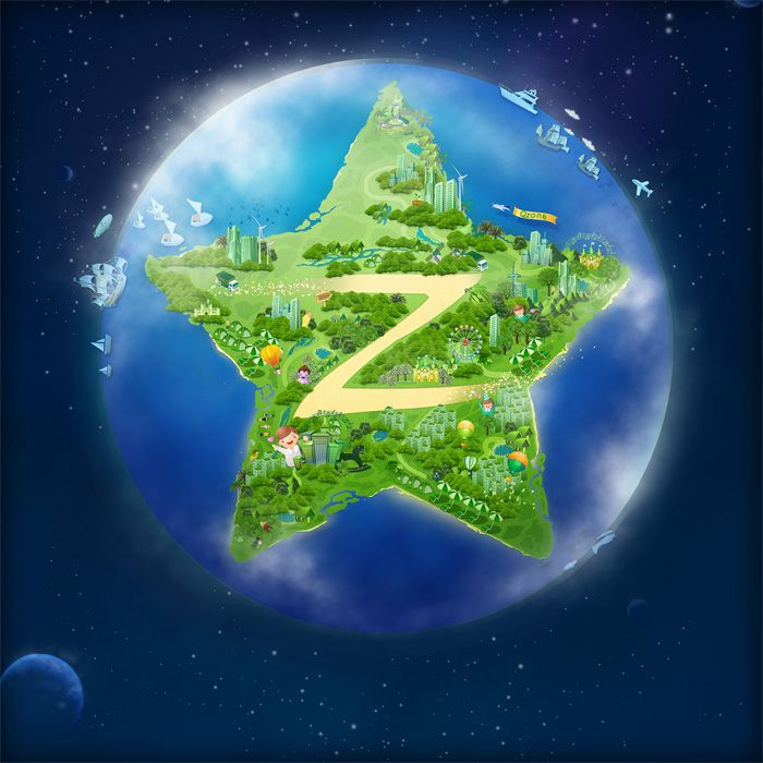 這樣的表現(xiàn)形式得到了大家一致認(rèn)同,不過(guò)“ing…”代表什么意思吶?恐怕很難讓人馬上理解。形式很好,內(nèi)容需要優(yōu)化!因此我們沿著這個(gè)方向發(fā)散,從內(nèi)容上考慮新的表現(xiàn)。就這樣地球村的想法孕育而出??臻gSNS平臺(tái)聯(lián)系著千萬(wàn)用戶,我們?cè)诳臻g里寫(xiě)日志、貼照片、停車(chē)、種水果、買(mǎi)賣(mài)好友…地球村這不正好是Qzone最好的表達(dá)嗎?想法出爐后,時(shí)間緊迫,熬夜是必然了。星球、綠地、樹(shù)、房子、道路,地球村漸漸有了模樣。
