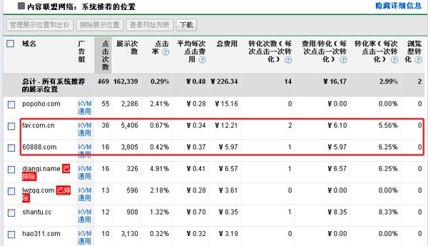 如果您啟用了Google Adwords轉(zhuǎn)化跟蹤工具,您也可以看到每個(gè)站點(diǎn)對應(yīng)的轉(zhuǎn)換數(shù)據(jù)。我們可以根據(jù)每次轉(zhuǎn)換成本來評估媒介的質(zhì)量。但是Google Adwords轉(zhuǎn)化跟蹤如果配置不合理可能會嚴(yán)重影響對媒介質(zhì)量的判斷,依靠谷歌分析來分析流量質(zhì)量會更可靠一些。