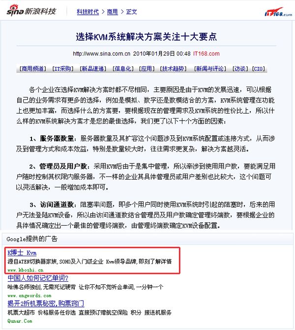 谷歌內(nèi)容廣告關(guān)鍵字匹配機(jī)制,是對細(xì)分群體定位的關(guān)鍵設(shè)置。(設(shè)置關(guān)鍵字匹配機(jī)制前,您一定要先了解您目標(biāo)客戶的關(guān)注點(diǎn)) 如果您設(shè)置過多的關(guān)鍵詞,那很有可能很多潛在的客戶根本無法看到你的廣告;如果您設(shè)置的關(guān)鍵詞太少,會影響匹配的精確性。在上面的圖示中,我們可以看到新浪上”KVM”相關(guān)的文章,匹配到K博士這組廣告。如果有許多競爭對手同時(shí)也投放到此網(wǎng)站,并且也是定義的”KVM”關(guān)鍵詞,在出價(jià)相同的條件下,K博士這組廣告毫無優(yōu)勢可言,但是如果我們定義2個(gè)關(guān)鍵詞”KVM”+”解決方案” 那么在這組頁面中我們的廣告相關(guān)性就更高,在出價(jià)相同的條件下,我們可以獲得更多的展示機(jī)會。
