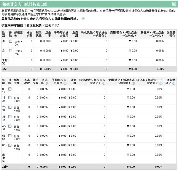 谷歌內(nèi)容網(wǎng)絡(luò)最具特色的一個(gè)功能,針對群體性別和年齡來定位,我們可以排除一些不可能使用我們產(chǎn)品的群體,還可以針對不同的群體設(shè)定不同的出價(jià)比例。 例如:我們在推廣一款網(wǎng)站分析監(jiān)測的產(chǎn)品,這部分群體大部分都是WA分析師在使用,群體大致在25~34歲之間,那么我們可以將此年齡群體的出價(jià)提升10%,這個(gè)群體類型的用戶將會有更多幾率看到我們的內(nèi)容網(wǎng)絡(luò)廣告。 這個(gè)功能準(zhǔn)確性有待驗(yàn)證!