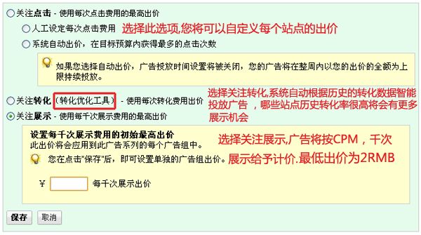 通常我們選擇”人工設(shè)定每次點(diǎn)擊費(fèi)用”即可! 如果我們投放的站點(diǎn)廣告點(diǎn)擊率非常之高,或者我們投放站點(diǎn)競爭對手廣告非常多,那么我們可以考慮采用千次展示費(fèi)用出價(jià),盡可能獲得更多的展示機(jī)會??傊梢試L試不同的出價(jià)模式,看哪種模式投資回報(bào)率更高了! 按照展示來出價(jià)的選項(xiàng)必須要啟動谷歌ADWORDS轉(zhuǎn)換優(yōu)化工具,才可以使用!系統(tǒng)會根據(jù)歷史轉(zhuǎn)換來智能投放,歷史轉(zhuǎn)換高的站點(diǎn)有更高的展示機(jī)會,此選項(xiàng)不建議新手使用。我曾經(jīng)嘗試過使用此選項(xiàng),但是轉(zhuǎn)化效果遠(yuǎn)不如使用“人工設(shè)定每次點(diǎn)擊費(fèi)用”選項(xiàng)配置。