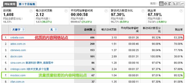 我們可以通過幾個(gè)重要指標(biāo)來評估內(nèi)容站點(diǎn)的質(zhì)量(平均停留時(shí)間、跳出率、KPI轉(zhuǎn)換率),排除流量質(zhì)量和KPI轉(zhuǎn)換效果較差的站點(diǎn),添加新的相關(guān)內(nèi)容網(wǎng)絡(luò)站點(diǎn)。不斷執(zhí)行優(yōu)化的過程中,您可能會驚喜的發(fā)現(xiàn)您的廣告投資回報(bào)率在不斷增長。 如果您的Google Adwords帳戶已經(jīng)和谷歌分析(Google Analytics)帳戶鏈接整合,那么您可以通過谷歌分析報(bào)表數(shù)據(jù),分析出以網(wǎng)站定位廣告系列中的所有站點(diǎn)的質(zhì)量。