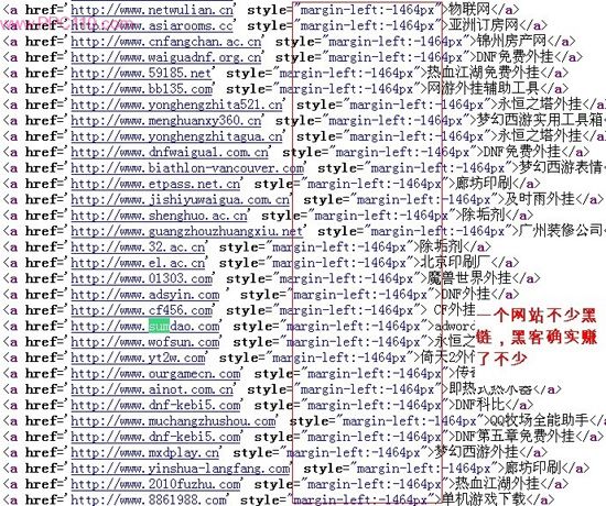 黑鏈的代碼有一定規(guī)律性,這個掛黑鏈的方法已經(jīng)被Google覺察。代碼截圖如下: