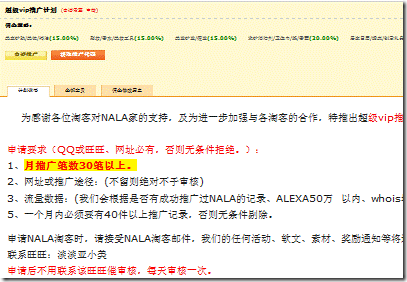 這個計劃一定要是審核的,而且審核時要高要求,要嚴格。比如我們,月推廣30單以上,才可以申請,每月定期審核,月推廣沒達到40單的,清理出去。申請時,沒達到標準的,我們會請他去申請其他計劃。要保證這個VIP計劃確實是高標準的,特別為獎勵大淘客去設(shè)置的。