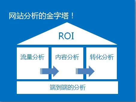 網(wǎng)站分析的整個(gè)過(guò)程是一個(gè)金字塔的結(jié)構(gòu)。金字塔的頂部是網(wǎng)站的目標(biāo):投資回報(bào)率(ROI)。要達(dá)到這個(gè)目標(biāo),我們首先需要有訪(fǎng)問(wèn)者,所以第一部分是網(wǎng)站的流量分析。其次,我們要針對(duì)訪(fǎng)問(wèn)者的需求,有效的展示我們的內(nèi)容,商品和信息。并且讓客戶(hù)喜歡這些內(nèi)容。因此,第二部分我們要對(duì)網(wǎng)站的內(nèi)容進(jìn)行分析。內(nèi)容分析涵蓋的范圍比較廣,包括導(dǎo)航分析,頁(yè)面質(zhì)量分析等等。最后,也是最關(guān)鍵的部分,我們要讓訪(fǎng)問(wèn)者轉(zhuǎn)化為客戶(hù),購(gòu)買(mǎi)我們的信息和商品。只有訪(fǎng)問(wèn)者完成了最后的轉(zhuǎn)化,我們才能完成網(wǎng)站的最終目標(biāo)。因此我們要對(duì)網(wǎng)站的轉(zhuǎn)化進(jìn)行分析。最后,每一個(gè)問(wèn)題都不是單一的原因引起的,每一個(gè)分析也都不是孤立存在的,因此我們還需要串聯(lián)整個(gè)訪(fǎng)問(wèn)和購(gòu)買(mǎi)過(guò)程。對(duì)網(wǎng)站進(jìn)行端到端的分析。下面,我們來(lái)逐一說(shuō)明每一部分的分析方法和我們要分析的內(nèi)容。
