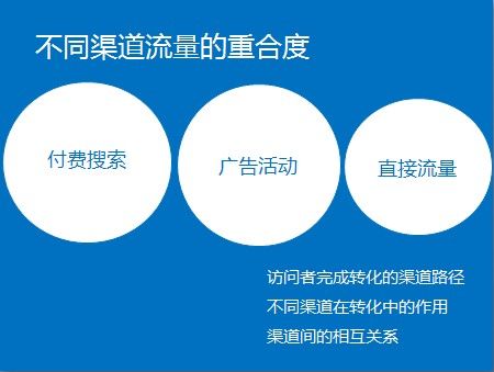 還記得前面的象限圖嗎,那里我們留下了一個(gè)問(wèn)題,第三象限質(zhì)較低的流量如何處理,是否可以直接砍掉。答案是不能。為什么呢?因?yàn)樵L(fǎng)問(wèn)者在整個(gè)的購(gòu)買(mǎi)過(guò)程中會(huì)穿梭于多個(gè)不同的流量渠道中,他們使用不同的工具對(duì)信息和商品進(jìn)行查詢(xún),對(duì)比并作出決策。并且越是價(jià)值高的商品,訪(fǎng)問(wèn)者需求的信息越多,決策時(shí)間越長(zhǎng)。而每個(gè)渠道在訪(fǎng)問(wèn)者的轉(zhuǎn)化的過(guò)程中也會(huì)扮演不一樣的角色。有些渠道吸引注意,樹(shù)立品牌形象。例如門(mén)戶(hù)的banner廣告,有些提供精準(zhǔn)信息,例如搜索引擎廣告。而有些幫助訪(fǎng)問(wèn)者進(jìn)行決策,比如比價(jià)和評(píng)論。因此,我們?cè)谔幚砬懊娴膯?wèn)題時(shí),對(duì)于質(zhì)比較差的第三象限流量渠道需要分析這個(gè)渠道與其他渠道間的關(guān)系,也就是渠道間的重合度。以及這個(gè)渠道在整個(gè)轉(zhuǎn)化過(guò)程中扮演的角色。這里我們可以看到,廣告活動(dòng),付費(fèi)搜索和直接流量間有明顯的重合。直接砍掉廣告活動(dòng)流量,或者降低廣告投放都有可能會(huì)影響另外兩個(gè)渠道的表現(xiàn)。