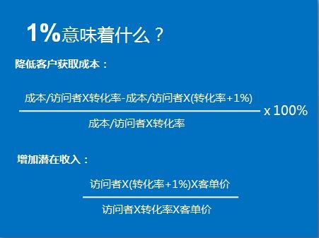 現(xiàn)在讓我們?cè)賮?lái)看一下1%對(duì)于網(wǎng)站來(lái)說(shuō)到底意味著什么?轉(zhuǎn)化率的提高意味著購(gòu)買(mǎi)流量的錢(qián)變的更有效,每個(gè)客戶(hù)的獲取成本更低。同時(shí),新增的客戶(hù)產(chǎn)生了更多的訂單,進(jìn)而創(chuàng)造了更多的收入。并且轉(zhuǎn)化率提升1%對(duì)于網(wǎng)站來(lái)說(shuō)是一個(gè)長(zhǎng)期的,穩(wěn)定的,并且可以不斷累加的效果。