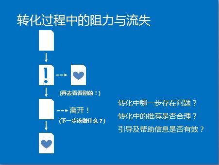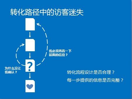 最后,我們來(lái)看下轉(zhuǎn)化分析。轉(zhuǎn)化渠道與前面的頁(yè)面導(dǎo)航很像,區(qū)別在于轉(zhuǎn)化渠道通常是一個(gè)目標(biāo)非常明確的封閉渠道。在這個(gè)渠道中我們希望訪(fǎng)問(wèn)者一路向前,不要回頭也不要離開(kāi),直到完成轉(zhuǎn)化目標(biāo)。對(duì)于轉(zhuǎn)化渠道,我們主要進(jìn)行兩部分的分析,分別是訪(fǎng)問(wèn)者的流失和迷失。下面先來(lái)看第一部分:轉(zhuǎn)化過(guò)程中的阻力的流失。轉(zhuǎn)化的阻力是造成訪(fǎng)問(wèn)者流失的主要原因之一。這里的阻力包括錯(cuò)誤的設(shè)計(jì)和錯(cuò)誤的引導(dǎo)。