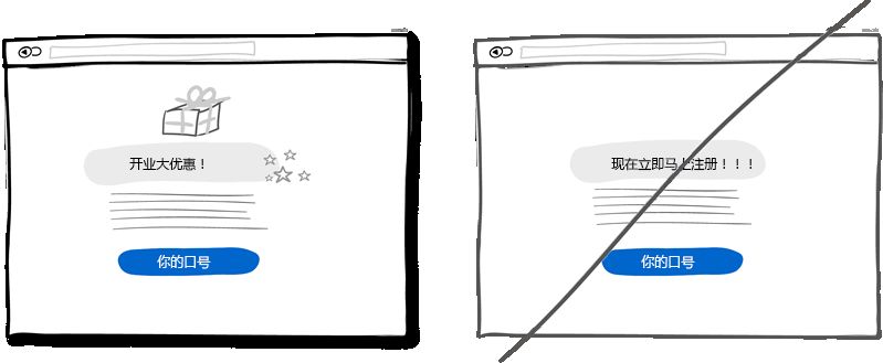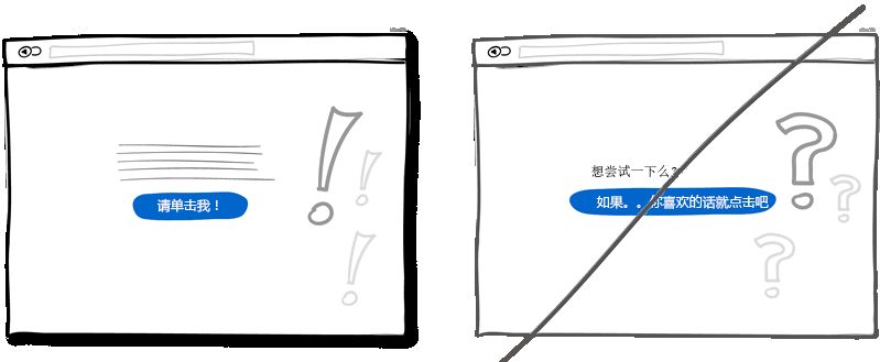 你可以通過不確定而顫抖的聲音來表達(dá)傳遞自己的意思,當(dāng)然也可以通過很自信的方式表達(dá)。如果你在界面中的表述用語多以問號結(jié)束,比如"也許","可能","感興趣?" 或者"想要試試么?",那么你完全還可以把語氣變得更堅(jiān)定一些。不過萬事無絕對,或許適當(dāng)放松措詞讓用戶有自行思考的余地也是可以的。