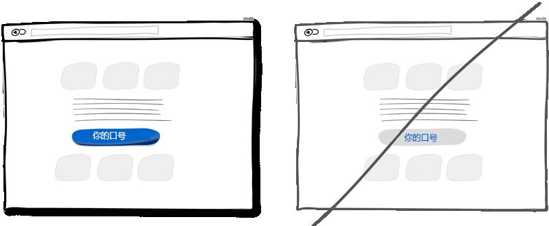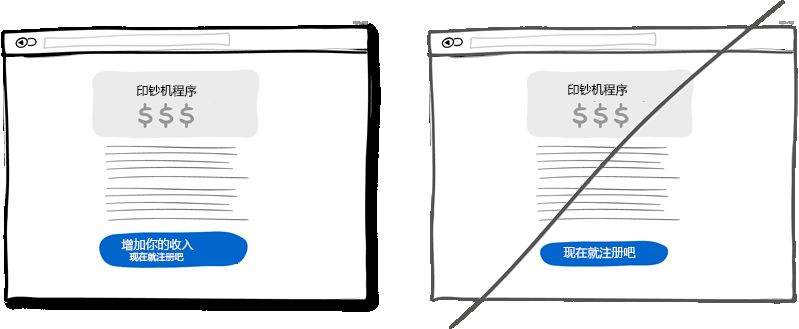 試想界面上有這樣兩個(gè)按鈕:一個(gè)是"獲取折扣",另一個(gè)是"立即注冊"。我敢打賭大多數(shù)人會點(diǎn)擊第一個(gè),因?yàn)榈诙€(gè)按扭讓人感覺不到有利可圖,并且"注冊"讓人聯(lián)想到填不完的表單。也就是說讓用戶感受到獲利的按鈕更有可能被點(diǎn)擊。這種讓用戶感到好處的文字信息也可是放在按鈕旁邊,不一定要做為按鈕的標(biāo)題。當(dāng)然,正常的按鈕還是有用處的,一般用于重復(fù)性操作頻繁的地方。