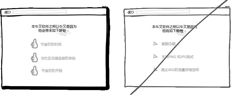市場就是這樣的,用戶永遠(yuǎn)只關(guān)心自身利益而產(chǎn)品特性對他們來說倒不是那么重要。只有利益才更直觀地體現(xiàn)出使用產(chǎn)品所帶來的價(jià)值。Chris Guillebeau在他的著作《100美元起家》中指出,相比壓力,沖突,煩心事和未知的未來,人們在乎得更多的是愛,金錢,認(rèn)同感和自由支配的空閑時(shí)間。所以我相信在展示產(chǎn)品特性時(shí)回歸到利益上是必要的。