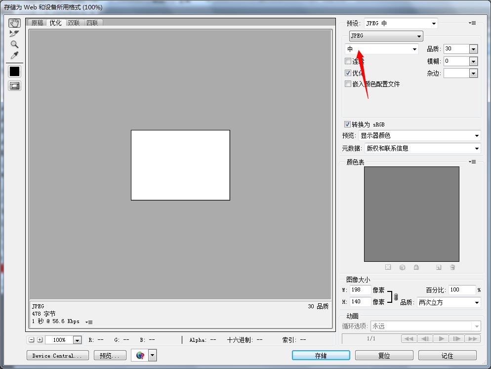 第二步:根據(jù)你的需求選擇格式和圖片的質(zhì)量,如果圖片不需要描述非常細(xì)節(jié),可以選擇中,如果有特殊需求,選擇高也沒(méi)有多大影響。然后點(diǎn)擊【存儲(chǔ)】即可。