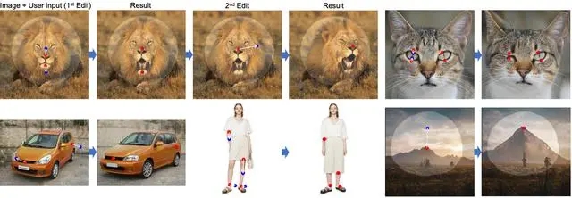 1. 基于點(diǎn)的編輯:DragGAN允許用戶通過在屏幕上拖動和放置點(diǎn)來直接更改圖像。這可以實現(xiàn)比傳統(tǒng)圖片編輯軟件更準(zhǔn)確和逼真的調(diào)整。